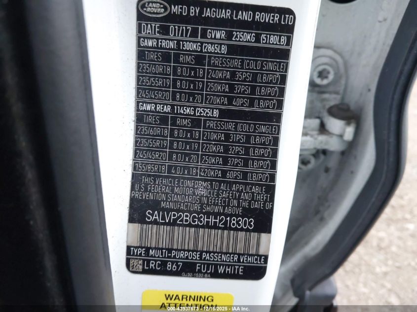 2017 LAND ROVER RANGE ROVER EVOQUE - SALVP2BG3HH218303, цвет - Белый, 2.0, Бензин, Полный привод из США
