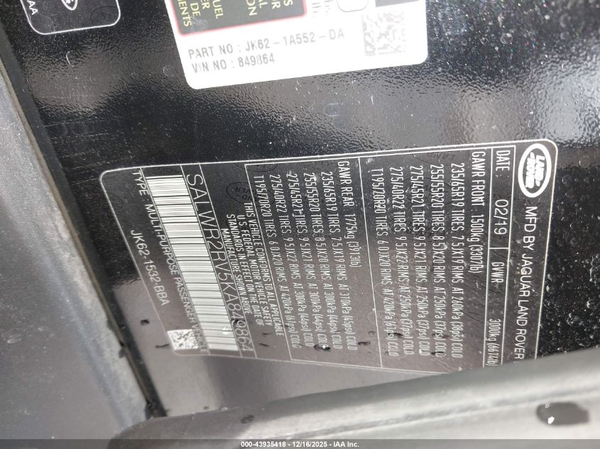 2019 LAND ROVER RANGE ROVER SPORT - SALWR2RV5KA849864, цвет - Черный, 3.0, Бензин, Полный привод из США