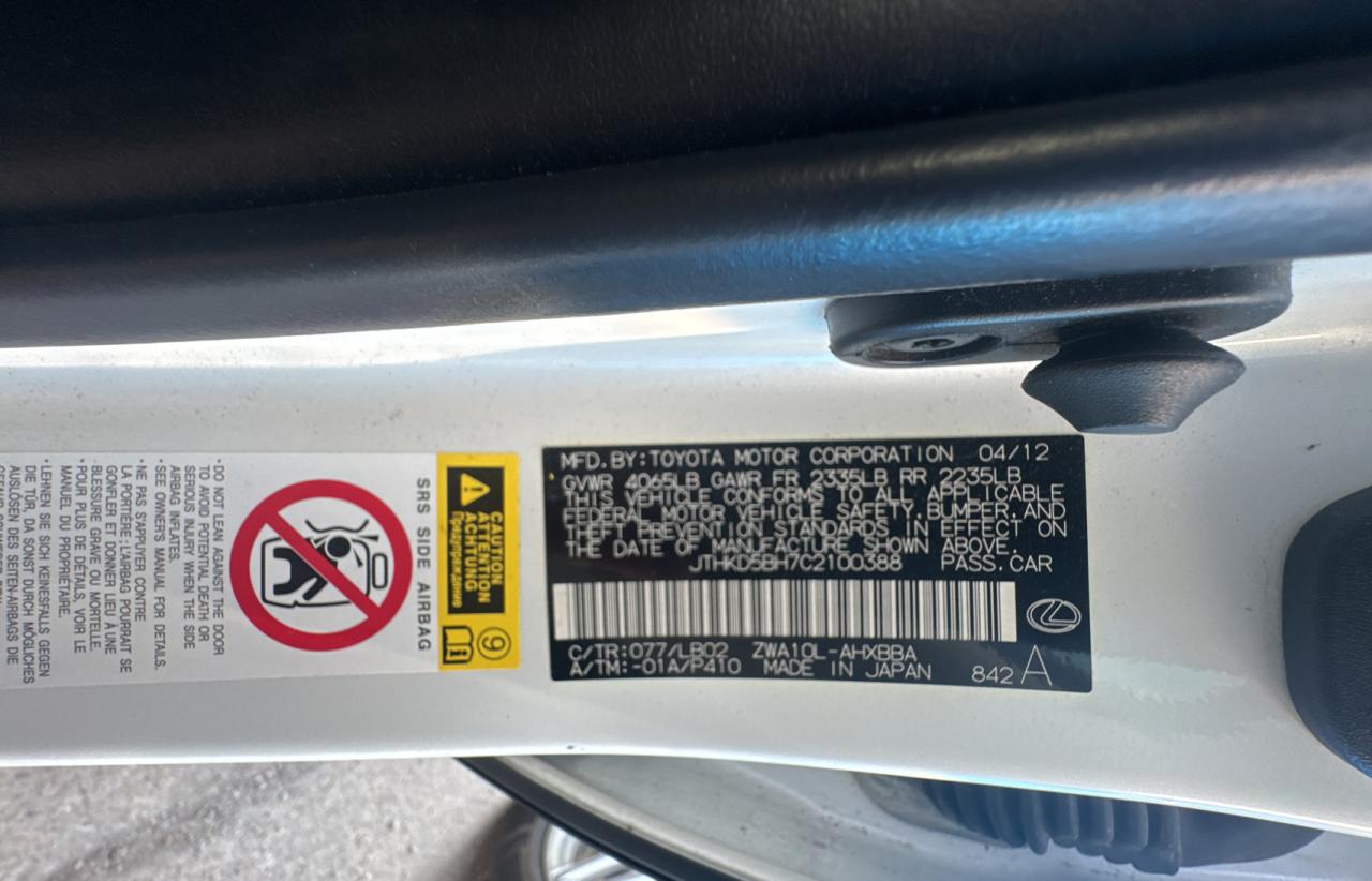 2012 LEXUS CT 200H - JTHKD5BH7C2100388, цвет - Белый, 1.8, Гибрид, из США