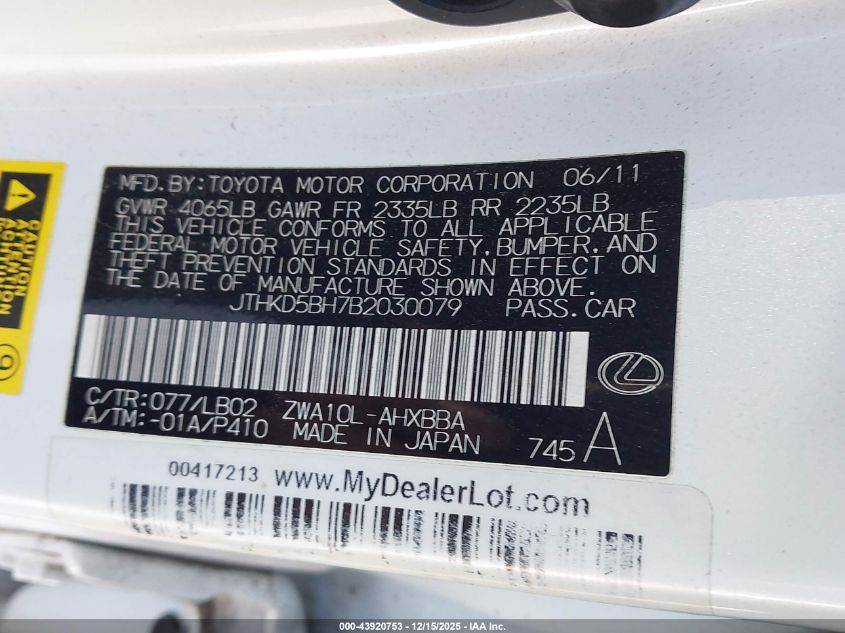 2011 LEXUS CT 200H - JTHKD5BH7B2030079, цвет - Белый, 1.8, Гибрид, Передний привод из США