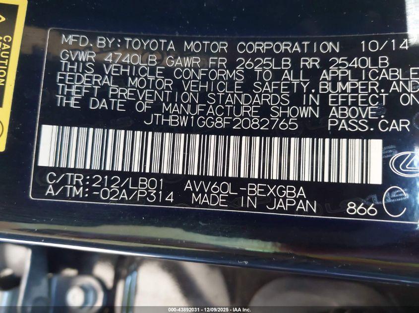 2015 LEXUS ES 300H - JTHBW1GG8F2082765, цвет - Черный, 2.5, Гибрид, Передний привод из США