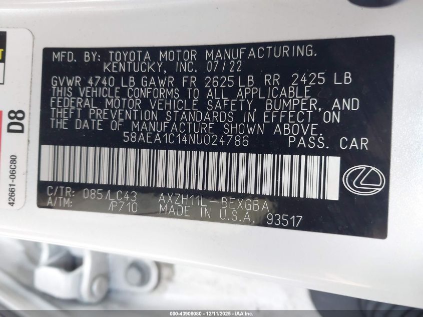 2022 LEXUS ES 300H - 58AEA1C14NU024786, цвет - Белый, 2.5, Гибрид, Передний привод из США