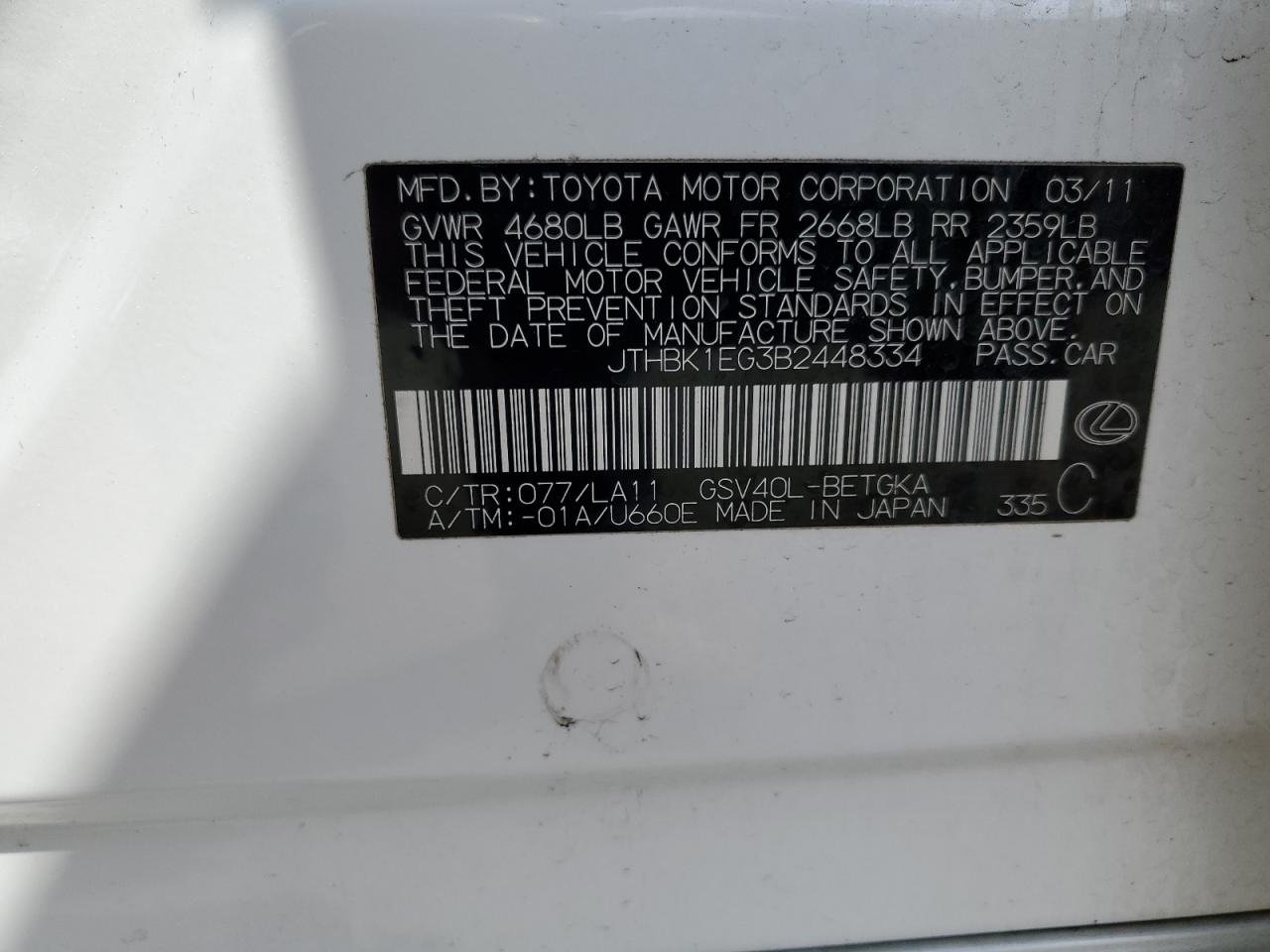 Цвет БелыйЦилиндры 6VIN JTHBK1EG3B2448334Состояние НеизвестноПовреждения Задняя