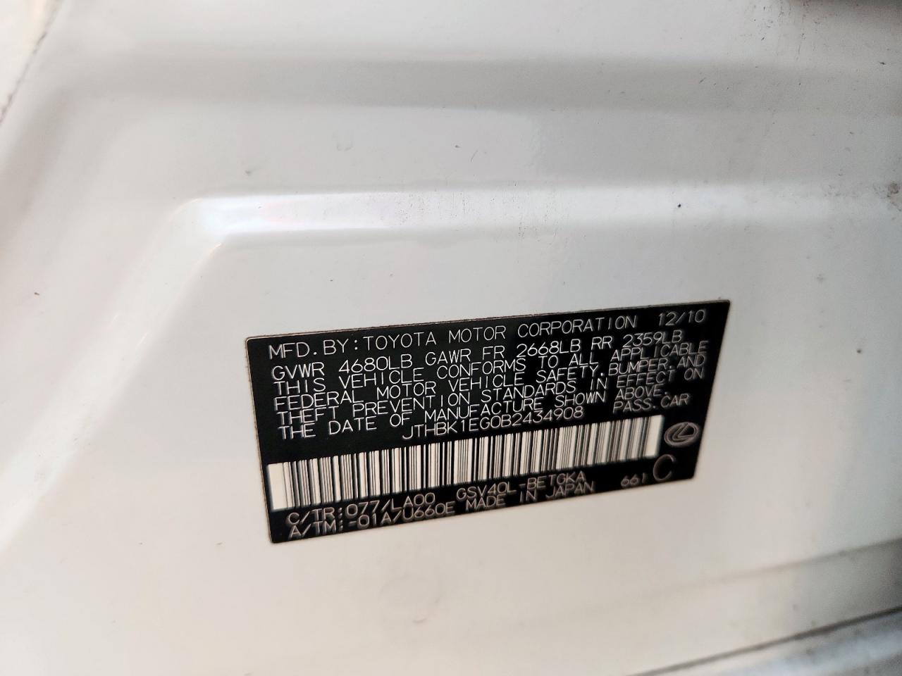 Цвет БелыйЦилиндры 6VIN JTHBK1EG0B2434908Состояние Заводится и едет (проверено)Повреждения Передняя или задняяДата аукциона 2025-10-20