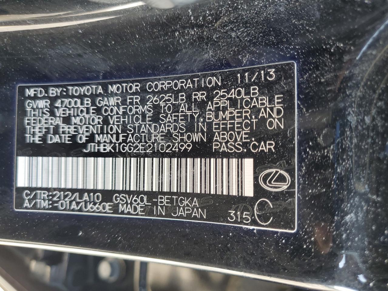 Цвет ЧерныйЦилиндры 6VIN JTHBK1GG2E2102499Состояние ЗаводитсяПовреждения НезначительныеДата аукциона 2025-10-20