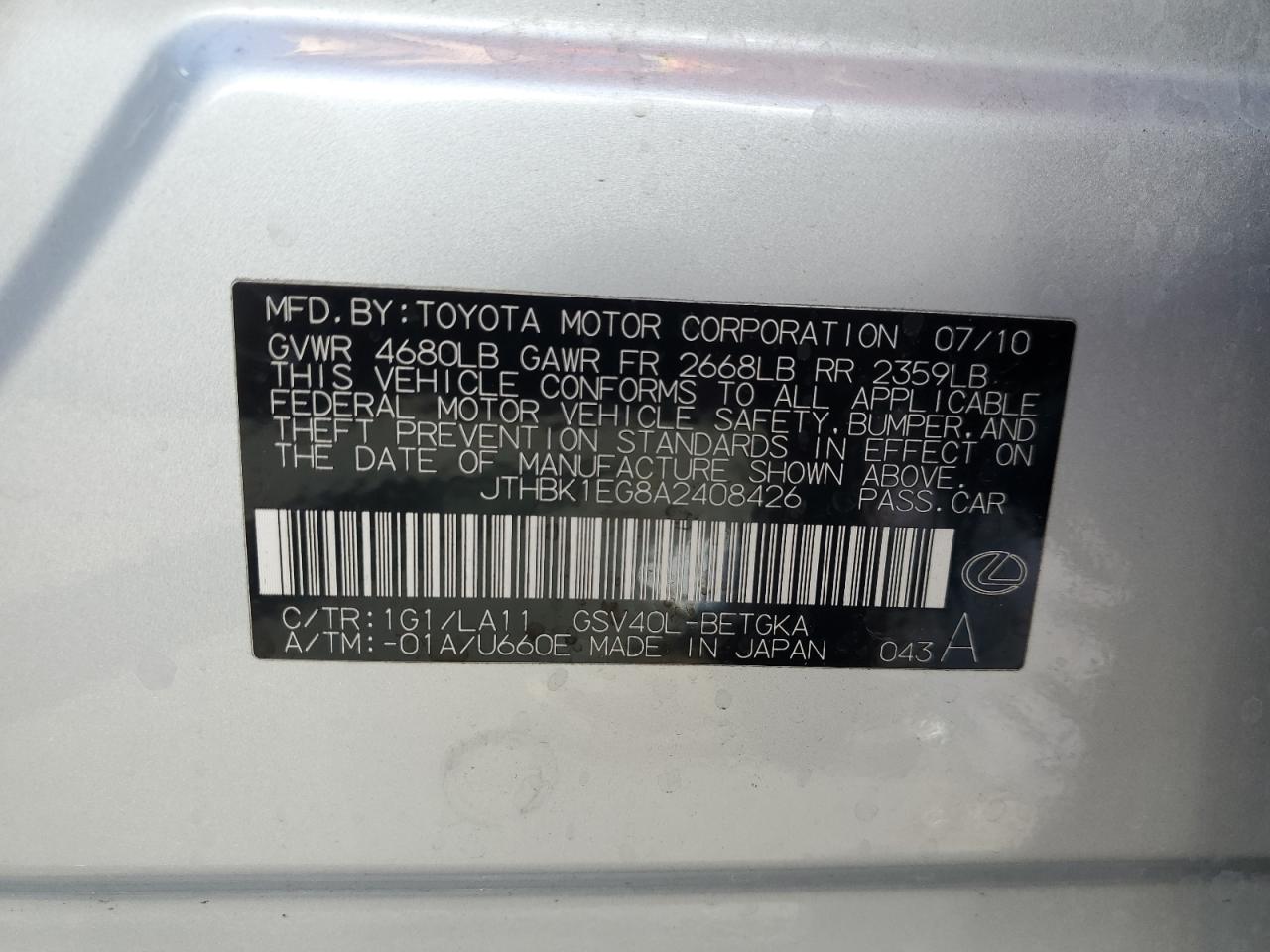 Цвет СеребряныйЦилиндры 6VIN JTHBK1EG8A2408426Состояние Заводится и едет (проверено)Повреждения ВодаДата аукциона 2025-10-28