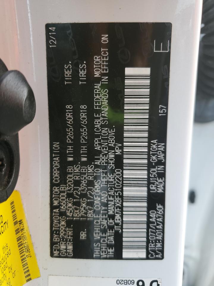 Цвет БелыйЦилиндры 8Привод Полный приводVIN JTJBM7FX8F5102200Состояние Заводится и едет (проверено)Повреждения Передняя или задняяДата аукциона 2025-10-21