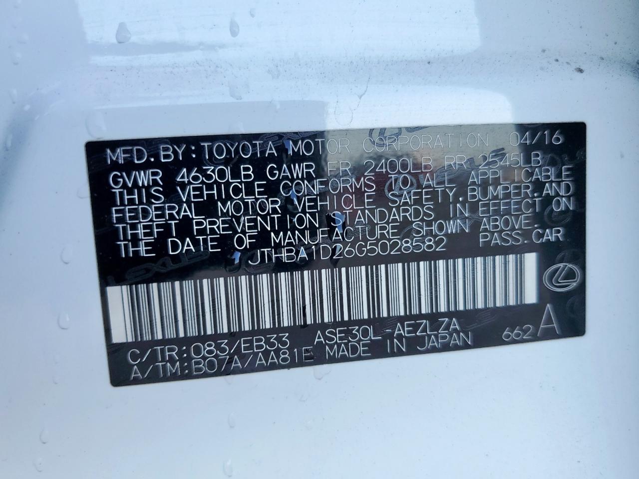Цвет БелыйЦилиндры 4Привод Задний приводVIN JTHBA1D26G5028582Состояние НеизвестноПовреждения Передняя или задняяДата аукциона 2025-10-20
