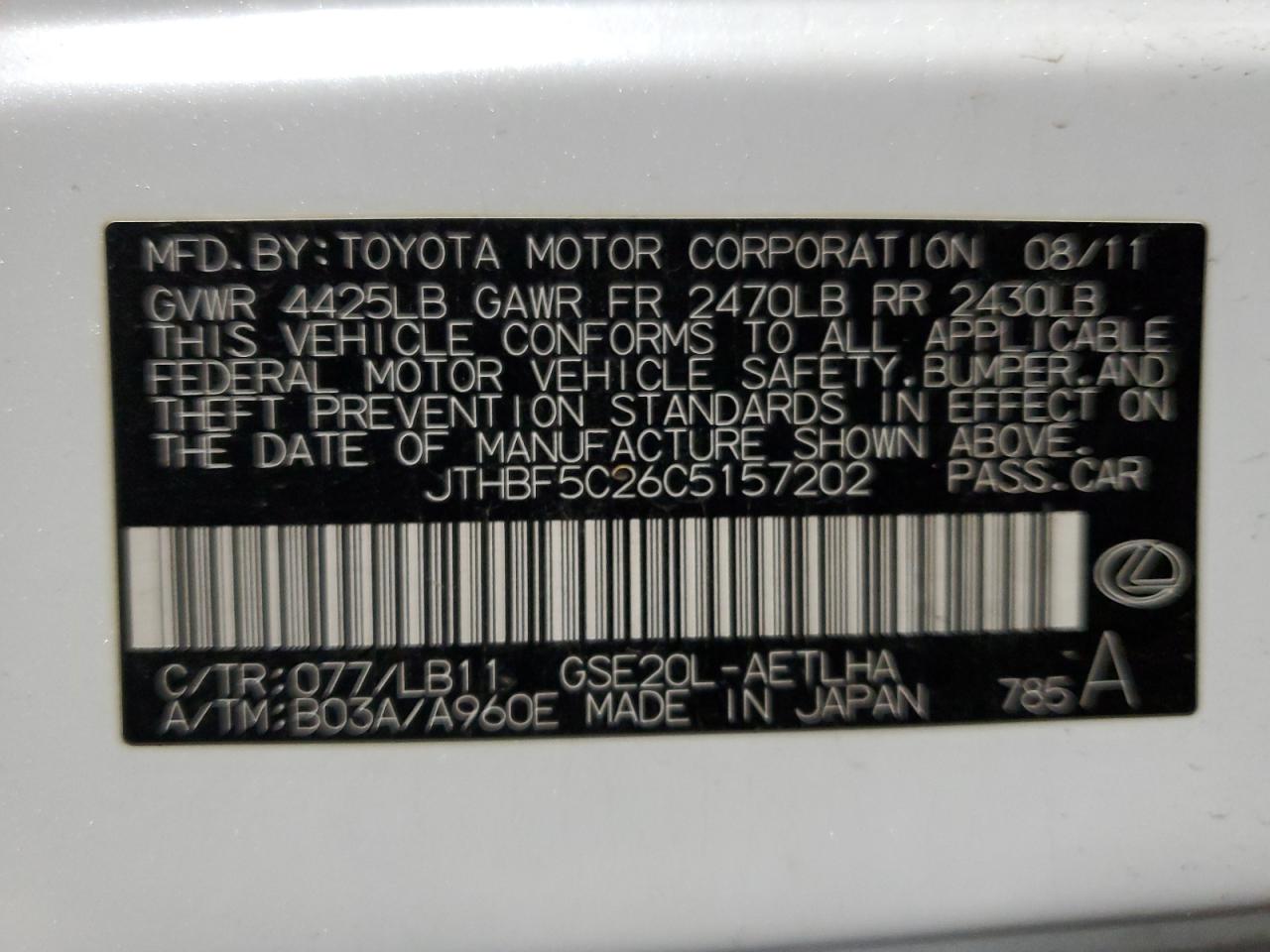Цвет БелыйЦилиндры 6Привод Задний приводVIN JTHBF5C26C5157202Состояние ЗаводитсяПовреждения НизДата аукциона 2025-10-20