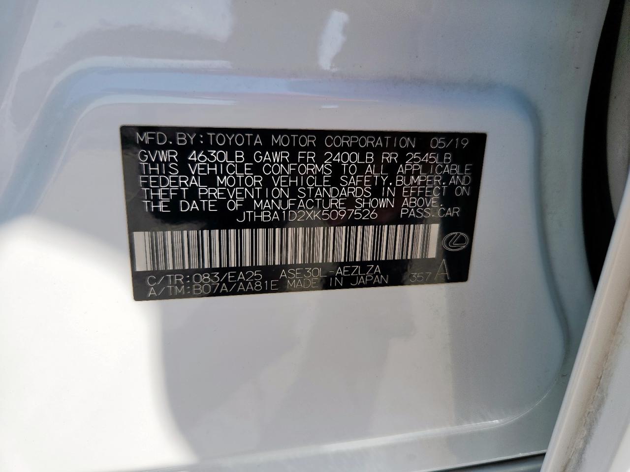 2019 LEXUS IS 300 - JTHBA1D2XK5097526, цвет - Белый, 2.0, Бензин, Задний привод из США