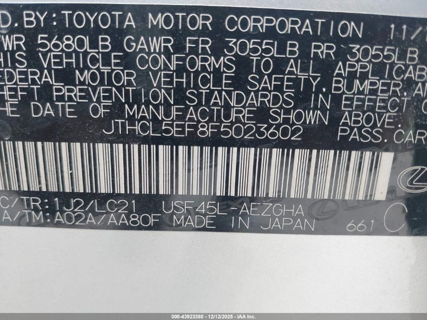 Цвет СеребряныйЦилиндры 8Привод Полный приводVIN JTHCL5EF8F5023602Состояние СтационарноПовреждения Обычный износ