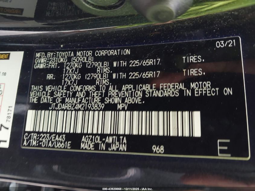 Цвет ЧерныйЦилиндры 4Привод Передний приводVIN JTJDARBZ4M2193839Состояние СтационарноПовреждения Передняя или задняя
