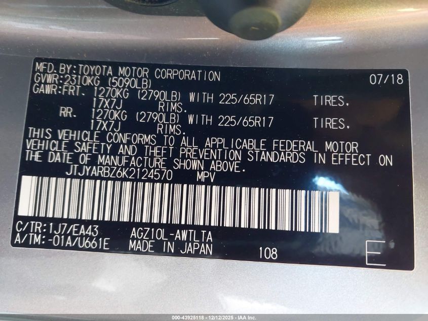 Цвет СеребряныйЦилиндры 4Привод Передний приводVIN JTJYARBZ6K2124570Состояние СтационарноПовреждения Передняя или задняя