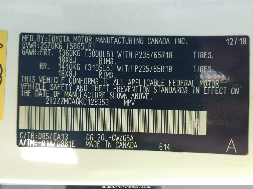 Цвет БелыйЦилиндры 6Привод Передний приводVIN 2T2ZZMCA6KC128353Состояние Заводится и едет (проверено)Повреждения Передняя или задняя