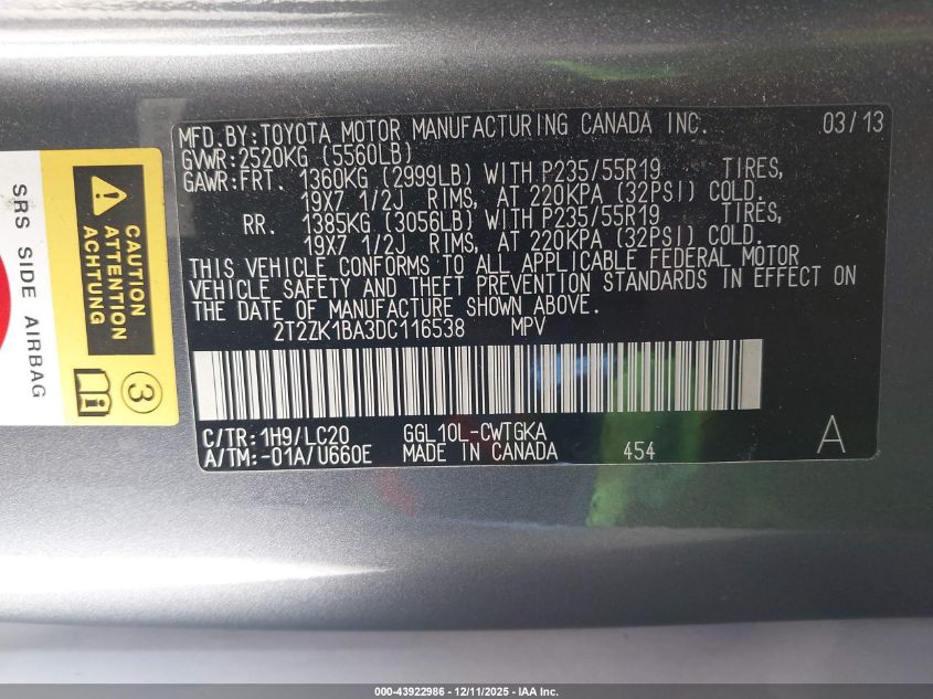 Цвет СерыйЦилиндры 6Привод Передний приводVIN 2T2ZK1BA3DC116538Состояние ЗаводитсяПовреждения Ходовая