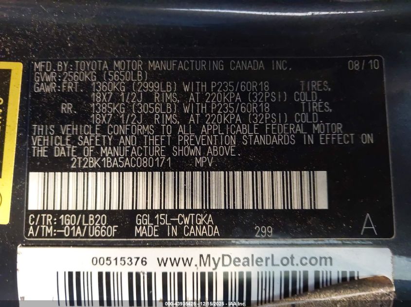 Цвет СерыйЦилиндры 6Привод Полный приводVIN 2T2BK1BA5AC080171Состояние СтационарноПовреждения По бокам