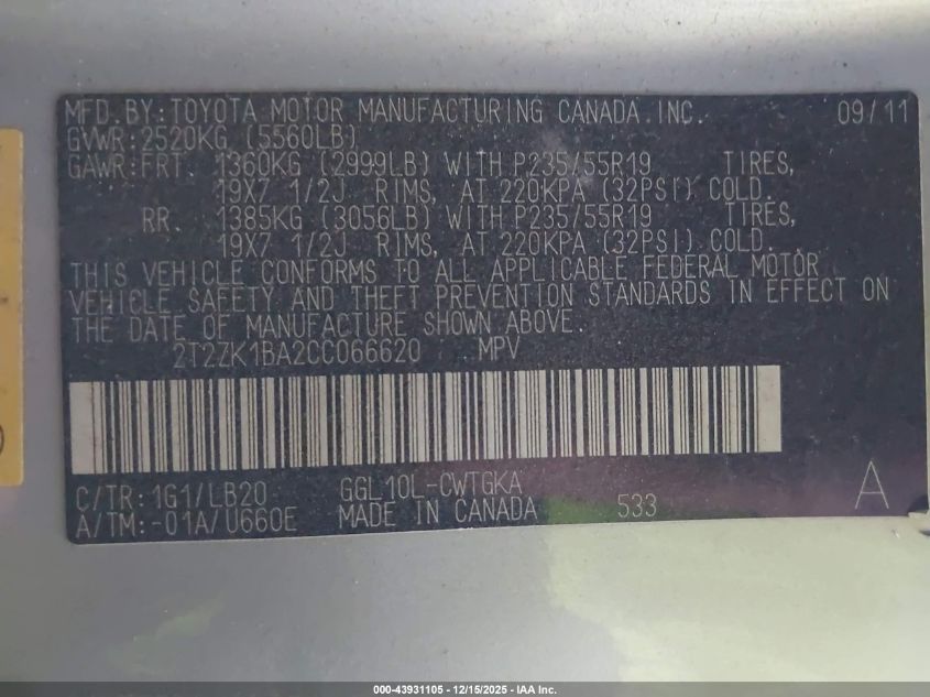 Цвет СеребряныйЦилиндры 6Привод Передний приводVIN 2T2ZK1BA2CC066620Состояние СтационарноПовреждения Левая сторона