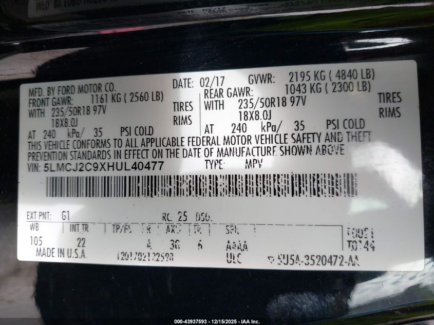 Цвет Цилиндры 4Привод Передний приводVIN 5LMCJ2C9XHUL40477Состояние НеизвестноПовреждения Неизвестно