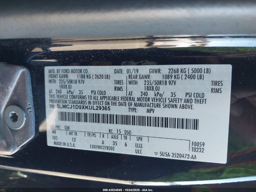 2019 LINCOLN MKC - 5LMCJ1D9XKUL29365, цвет - Черный, 2.0, Бензин, Полный привод из США
