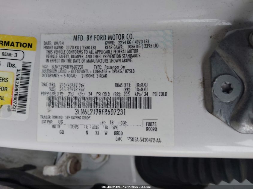 2015 LINCOLN MKZ - 3LN6L2J98FR607231, цвет - Белый, 2.0, Бензин, Полный привод из США