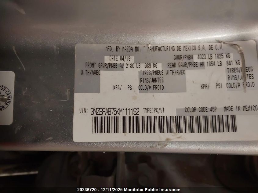2019 MAZDA 3 - 3MZBPAB75KM111192, цвет - Серебряный, , Бензин, Передний привод из США