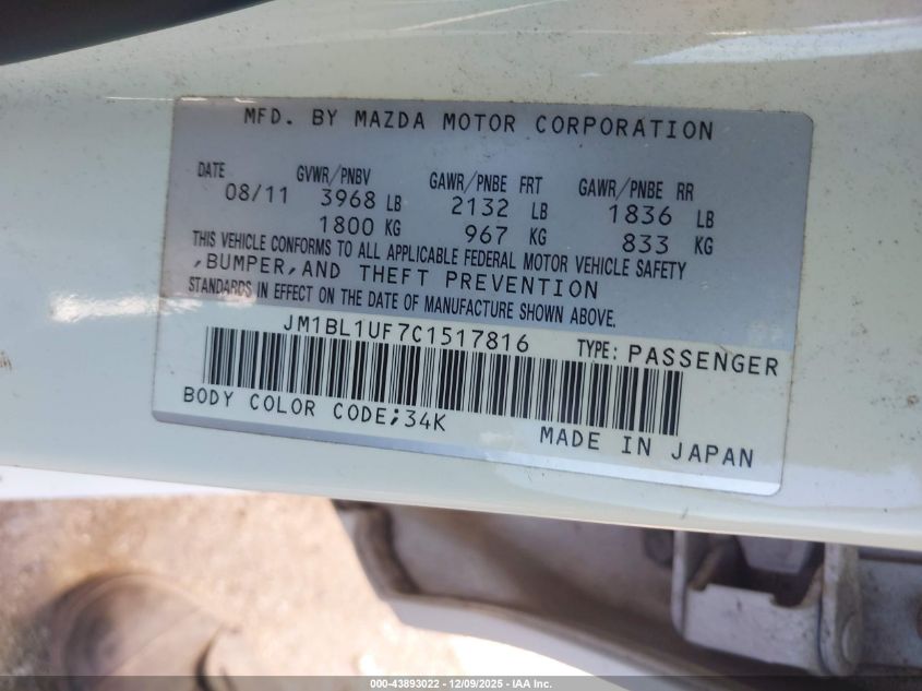Цвет БелыйЦилиндры 4Привод Передний приводVIN JM1BL1UF7C1517816Состояние Заводится и едет (проверено)Повреждения Передняя или задняяДата аукциона 2025-12-17