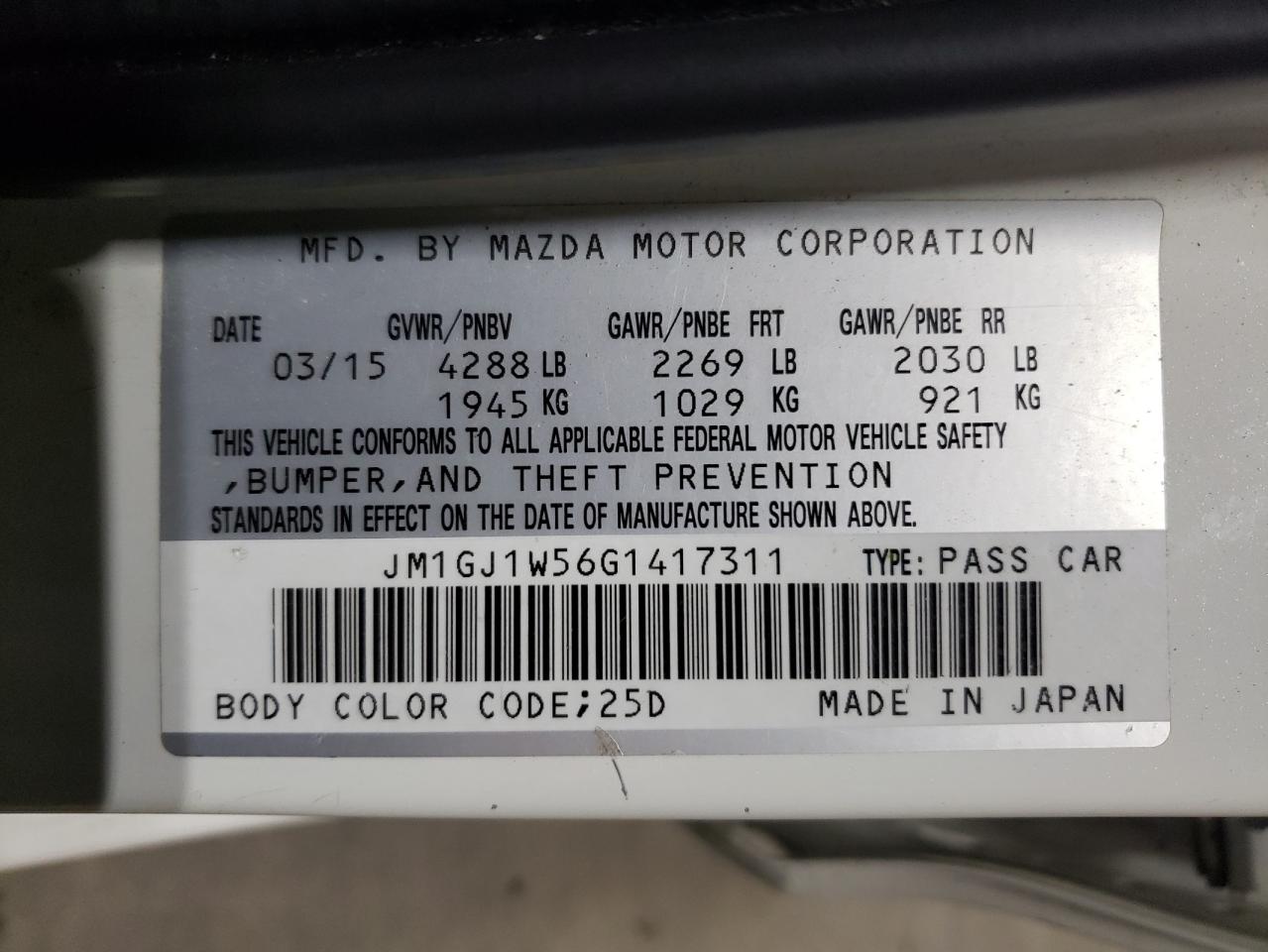2016 MAZDA 6 - JM1GJ1W56G1417311, цвет - Белый, 2.5, Бензин, из США