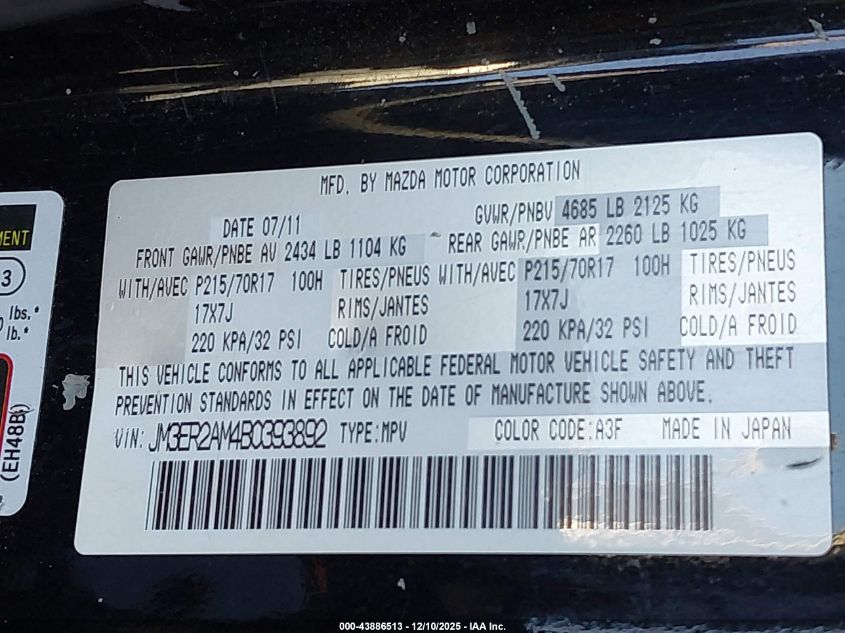 2011 MAZDA CX-7 - JM3ER2AM4B0393892, цвет - Черный, 2.5, Бензин, Передний привод из США