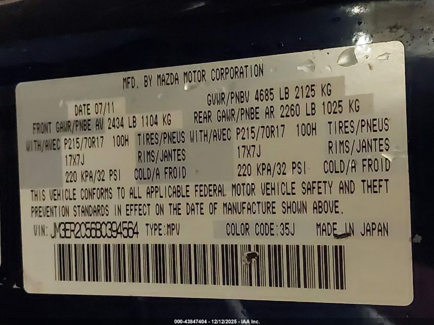 2011 MAZDA CX-7 - JM3ER2C56B0394564, цвет - Синий, 2.5, Бензин, Передний привод из США