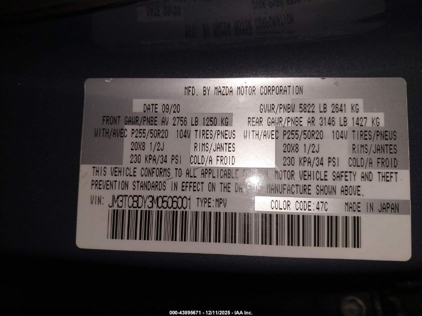 2021 MAZDA CX-9 - JM3TCBDY3M0506001, цвет - Серый, 2.5, Бензин, Полный привод из США