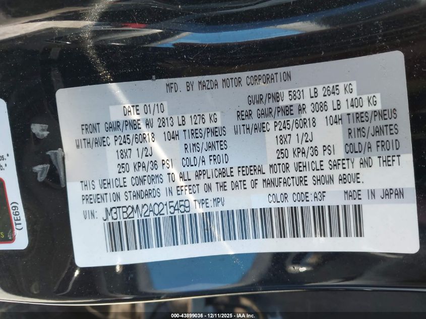 2010 MAZDA CX-9 - JM3TB2MV2A0215459, цвет - Черный, 3.7, Бензин, Передний привод из США