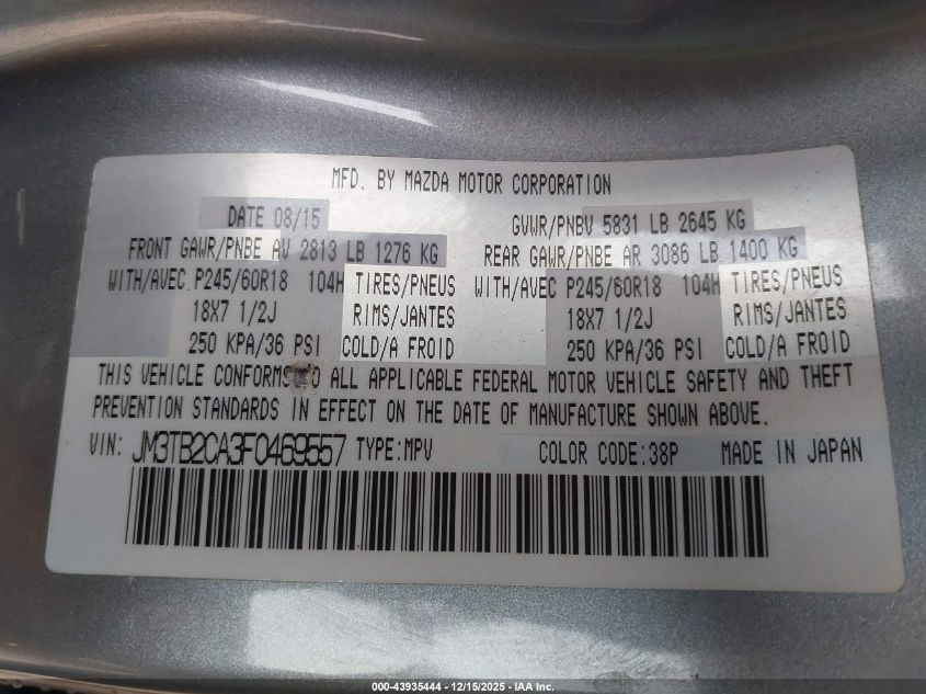 2015 MAZDA CX-9 - JM3TB2CA3F0469557, цвет - Серебряный, 3.7, Бензин, Передний привод из США