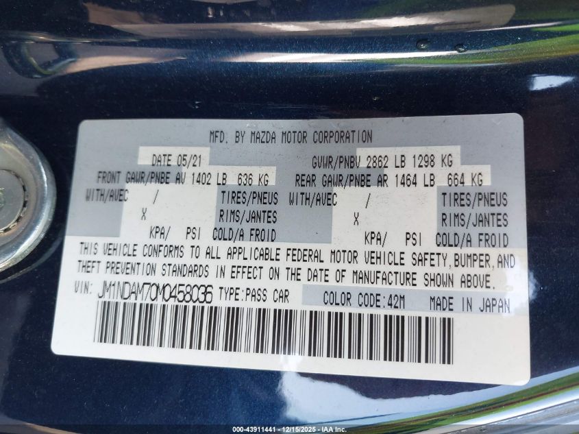 2021 MAZDA MX-5 - JM1NDAM70M0458036, цвет - Синий, 2.0, Бензин, Задний привод из США