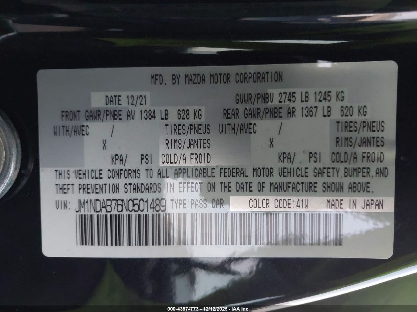2022 MAZDA MX-5 - JM1NDAB76N0501489, цвет - Черный, 2.0, Бензин, Задний привод из США