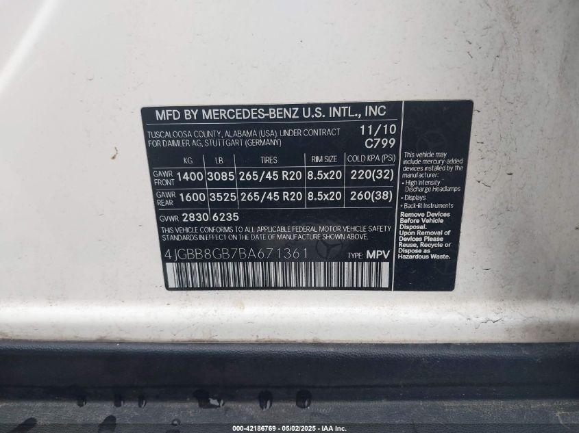 2011 MERCEDES-BENZ M-CLASS - 4JGBB8GB7BA671361, цвет - Белый, 3.5, Бензин, Полный привод из США