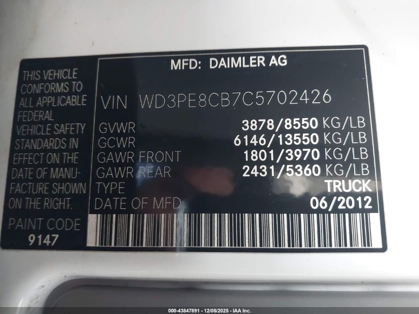 2012 MERCEDES-BENZ SPRINTER - WD3PE8CB7C5702426, цвет - Белый, 3.0, Дизель, Задний привод из США
