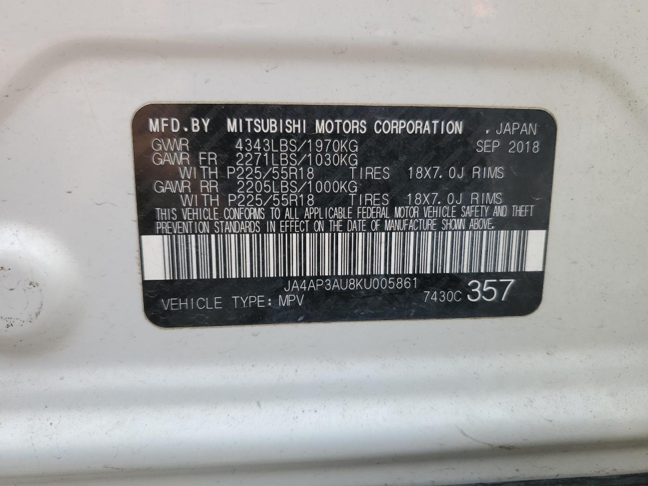 2019 MITSUBISHI OUTLANDER - JA4AP3AU8KU005861, цвет - Белый, 2.0, Бензин, из США