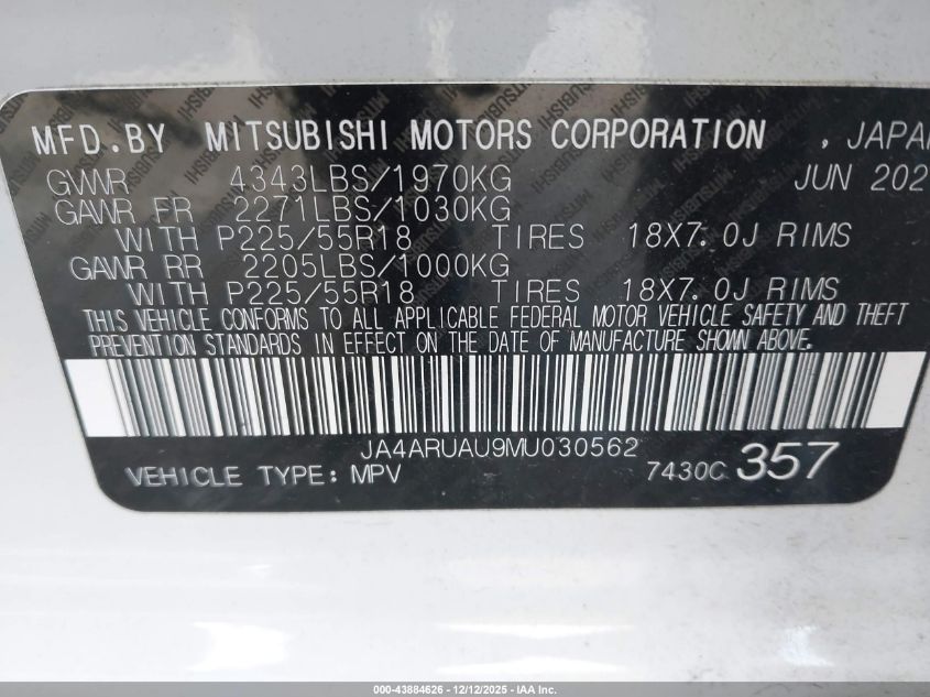 2021 MITSUBISHI OUTLANDER SPORT - JA4ARUAU9MU030562, цвет - Белый, 2.0, Бензин, Полный привод из США