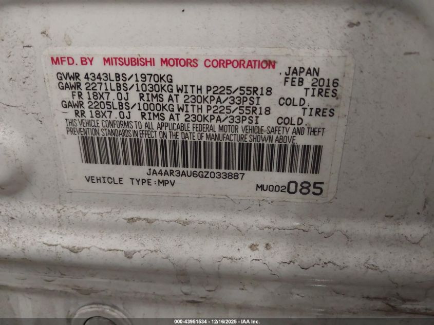 2016 MITSUBISHI OUTLANDER SPORT - JA4AR3AU6GZ033887, цвет - Белый, 2.0, Бензин, Полный привод из США