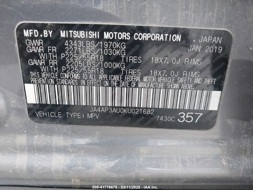 2019 MITSUBISHI OUTLANDER SPORT - JA4AP3AU0KU021682, цвет - Серый, 2.0, Бензин, Передний привод из США