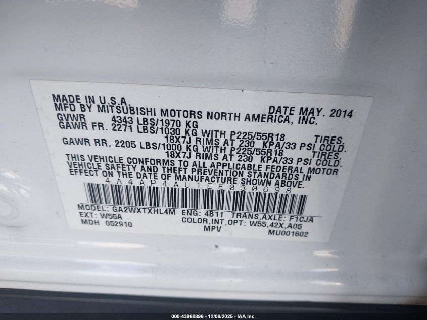 2014 MITSUBISHI OUTLANDER SPORT - 4A4AP4AU1EE030698, цвет - Белый, 2.0, Бензин, Передний привод из США