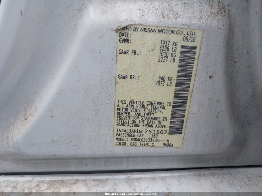 2016 NISSAN ALTIMA - 1N4AL3AP1GC251567, цвет - Белый, 2.5, Бензин, Передний привод из США