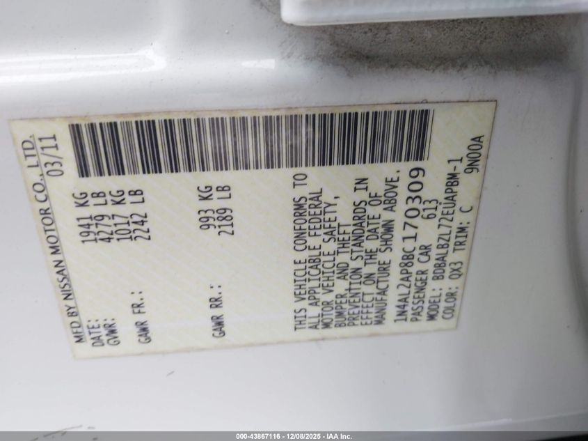 2011 NISSAN ALTIMA - 1N4AL2AP8BC170309, цвет - Белый, 2.5, Бензин, Передний привод из США