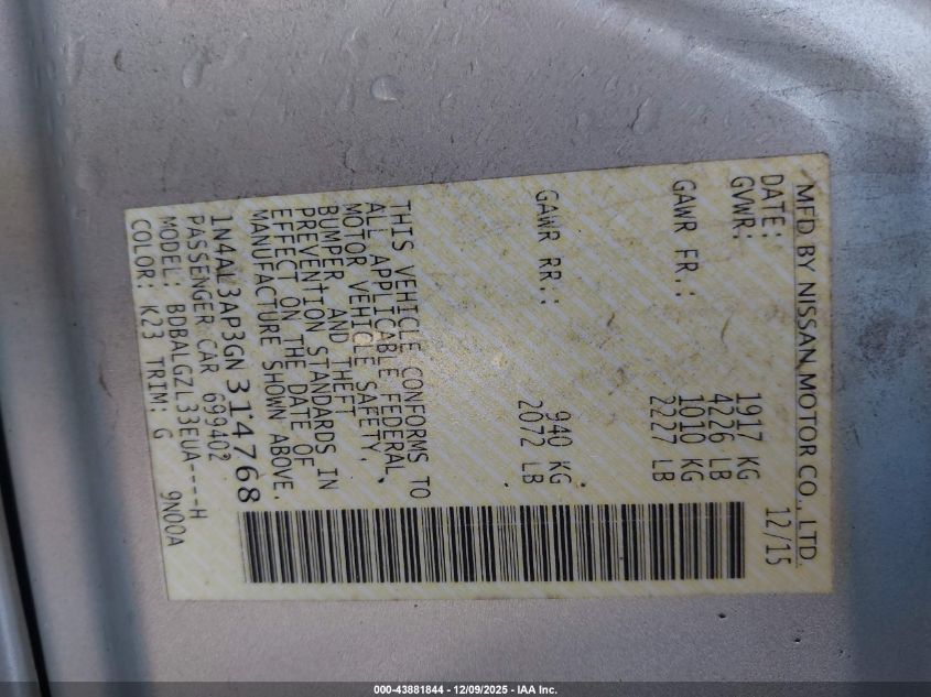 2016 NISSAN ALTIMA - 1N4AL3AP3GN314768, цвет - Серебряный, 2.5, Бензин, Передний привод из США