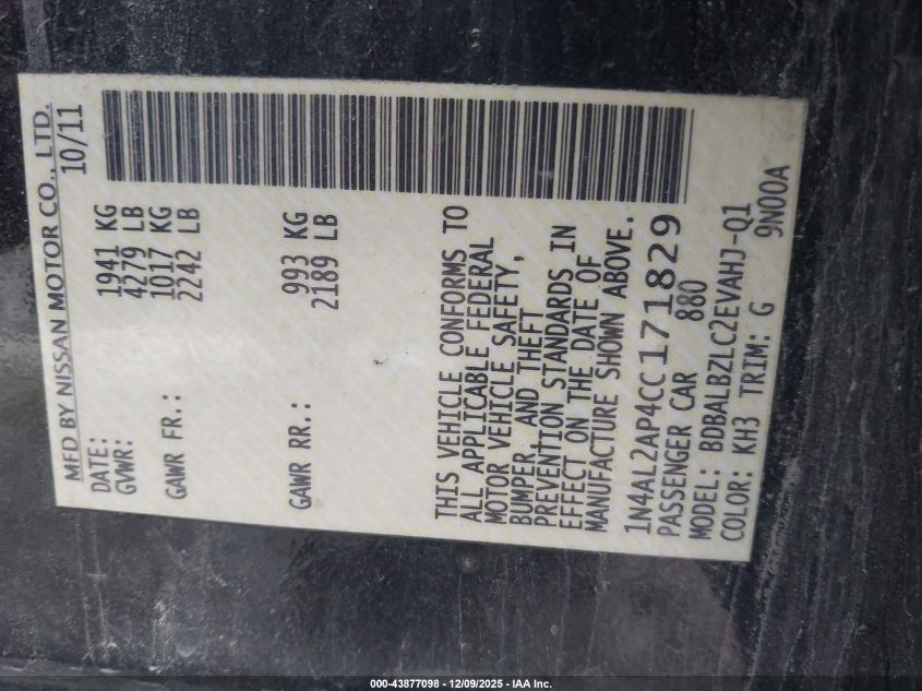 2012 NISSAN ALTIMA - 1N4AL2AP4CC171829, цвет - Черный, 2.5, Бензин, Передний привод из США