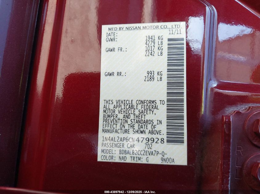 2012 NISSAN ALTIMA - 1N4AL2AP6CN479928, цвет - Бургундия, 2.5, Бензин, Передний привод из США