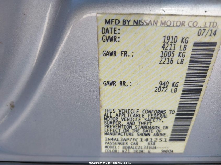 2015 NISSAN ALTIMA - 1N4AL3AP7FC141251, цвет - Серебряный, 2.5, Бензин, Передний привод из США