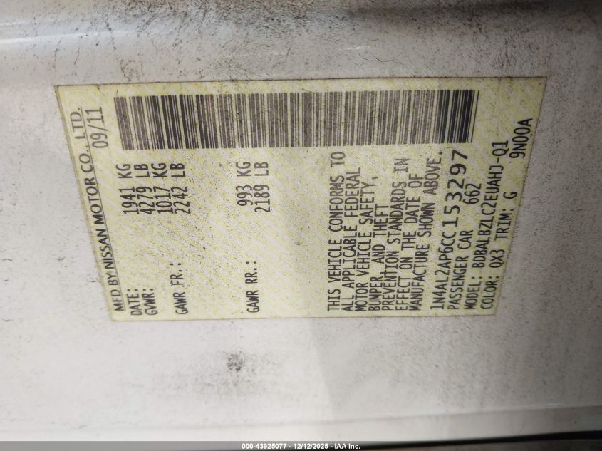 2012 NISSAN ALTIMA - 1N4AL2AP6CC153297, цвет - Белый, 2.5, Бензин, Передний привод из США