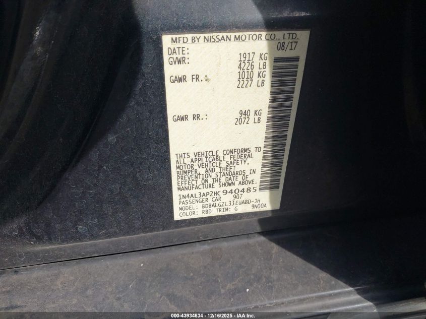 2017 NISSAN ALTIMA - 1N4AL3AP2HC940485, цвет - Черный, 2.5, Бензин, Передний привод из США