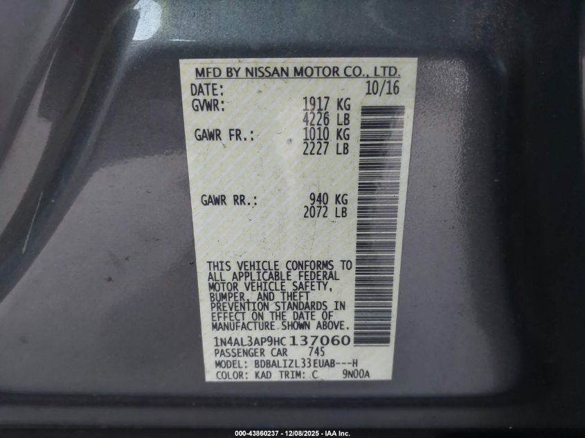 2017 NISSAN ALTIMA - 1N4AL3AP9HC137060, цвет - Серый, 2.5, Бензин, Передний привод из США